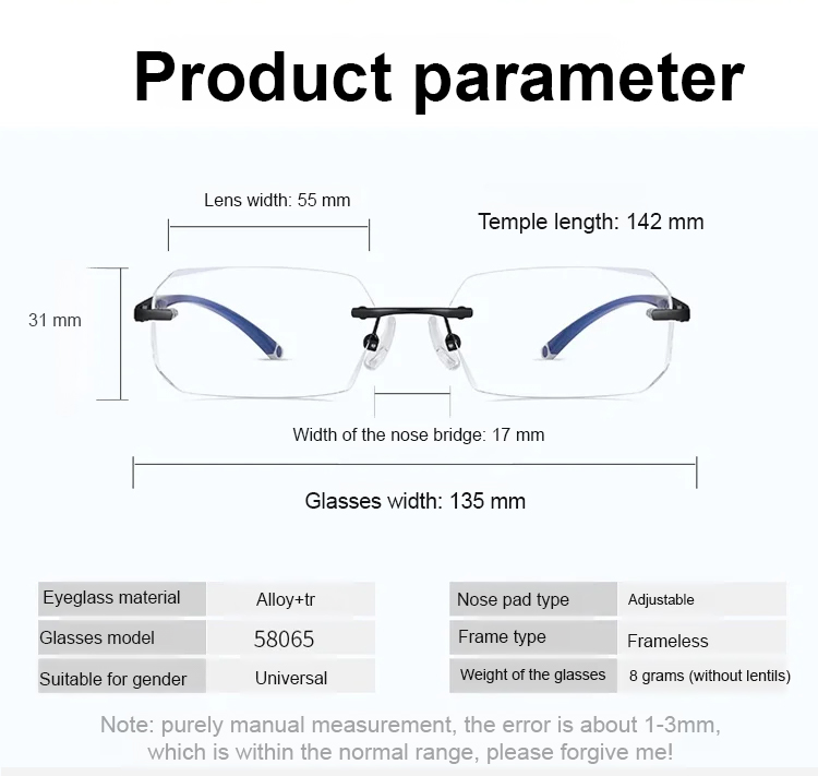 ● Experience ultimate eye protection with photochromic lenses that automatically adjust to changing light conditions, keeping your vision comfortable indoors and outdoors. ● Sleek diamond cut rimless design offers a modern, lightweight look that enhances any outfit while ensuring maximum comfort for all-day wear. ● Advanced blue light blocking technology reduces eye strain and fatigue caused by screens, making these glasses perfect for work, study, or gaming sessions. ● Durable, high-quality materials ensure long-lasting performance, while the rimless construction provides a clear, unobstructed view. ● Stylish and functional, these glasses are the ideal choice for anyone seeking both eye health and contemporary fashion in one accessory.