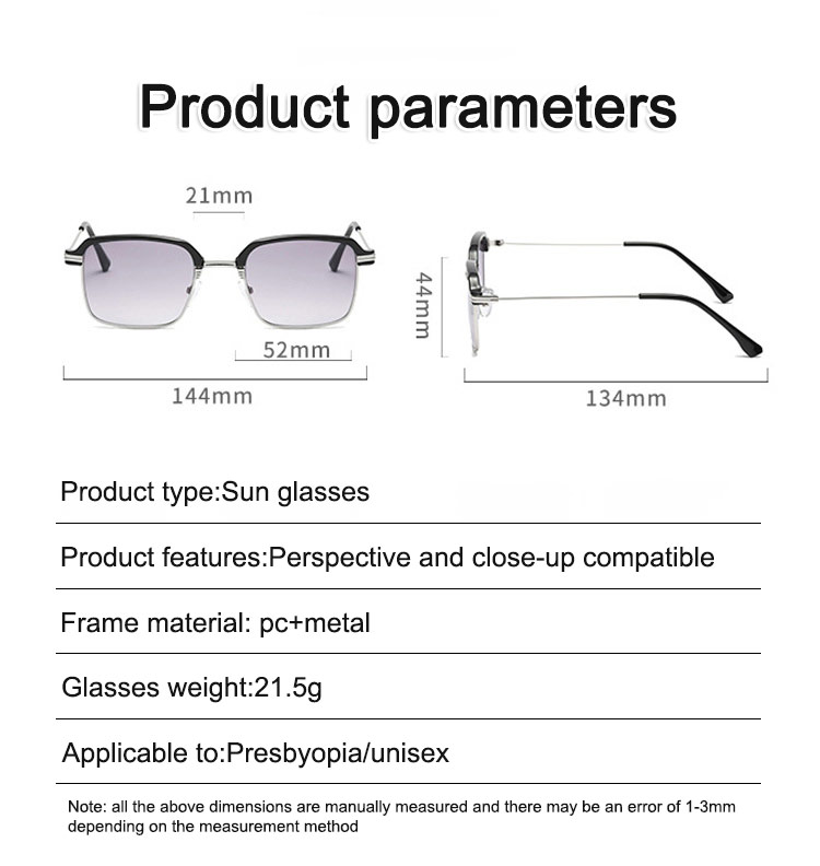 Color: Gold frame + progressive brown lenses + for both near and far vision, silver frame + progressive gray lenses + for both near and far vision