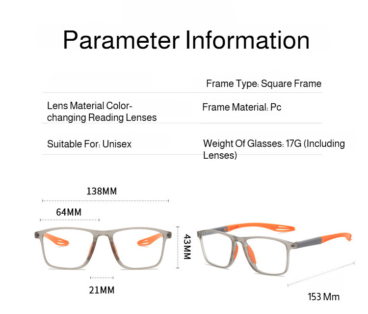 Sure! Here is the translation in English:**Color:** Grey frame with orange temples (multifocal photochromic grey), black frame with grey temples (multifocal photochromic grey)